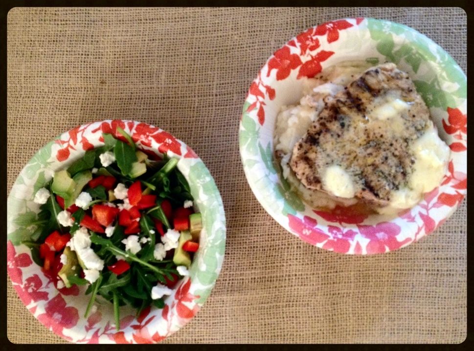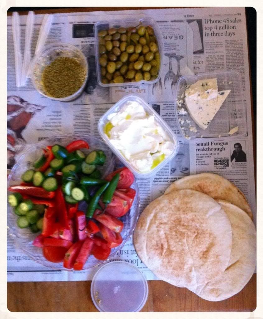 Our delicious meal! We added scrambled eggs and meat cooked in olive oil to the pita bread and